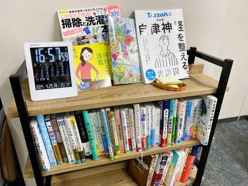 ↑こちらは川越センターの本棚です。いろいろなジャンルの書籍がありますので、個別訓練の時間などにご覧ください。
