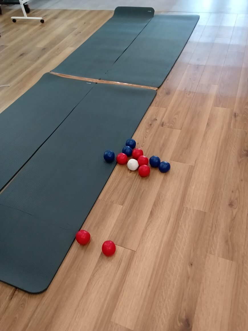 毎週行う運動プログラムで、ボッチャを体験しました。
