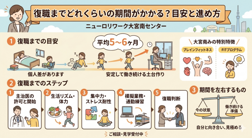 この記事では、リワークに通う方が復職までにかかる期間の目安や進め方についてお伝えします。