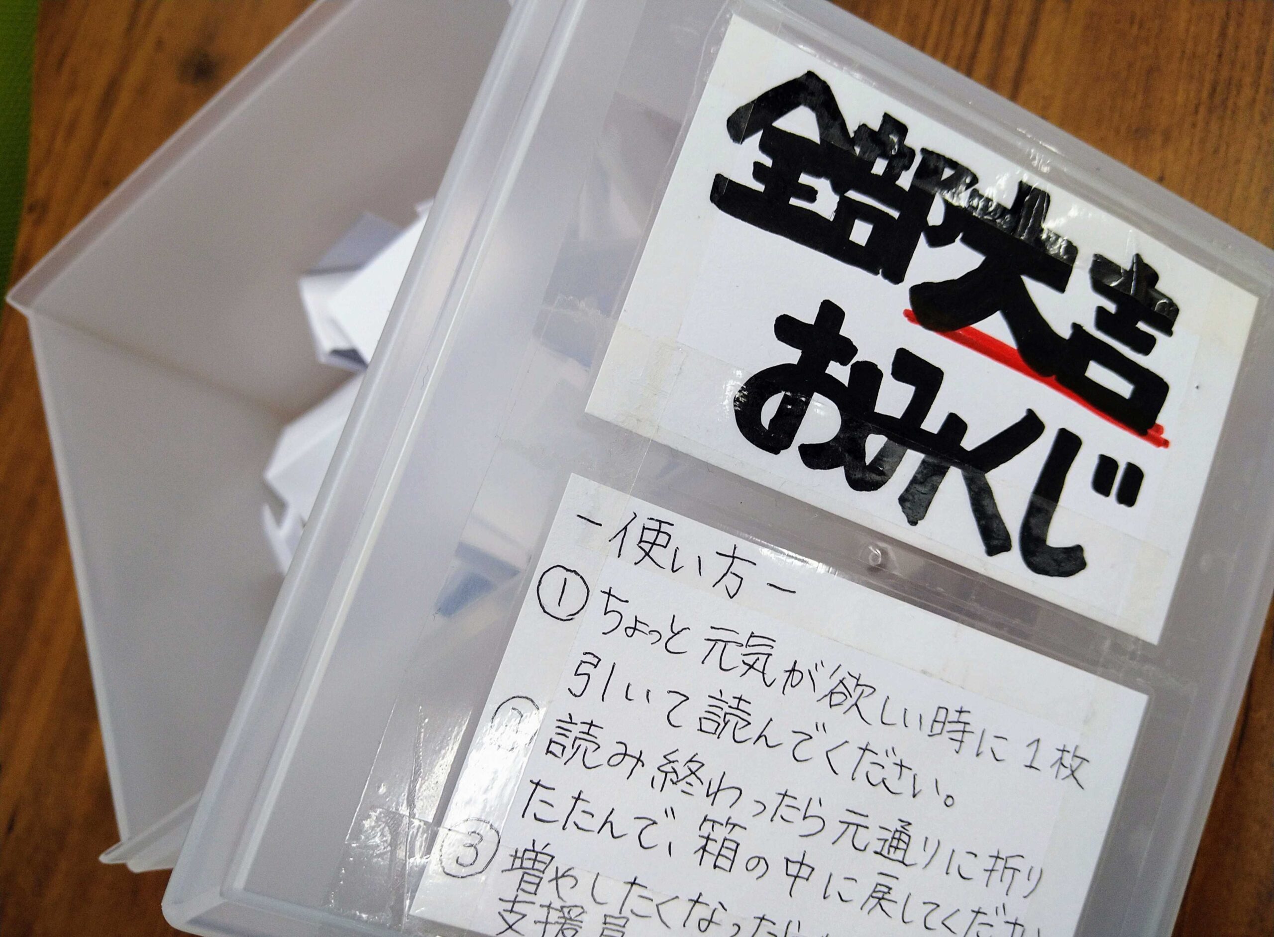 写真は支援員からの提案、『全部大吉おみくじ』。中身は全部大吉で、ちょっと嬉しくなるようなメッセージもいっしょに載っています。