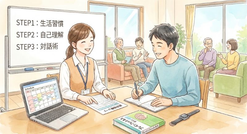 この「土台作り」と「自己分析」は、復職を目指す方だけでなく、これから自立を目指す方にとっても、将来の安定就労に直結する一生モノのスキルになります。