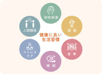 運動・食事・睡眠・ストレスケア・知的刺激・人間関係の6領域にバランスよく取り組むことで、心・身体・頭(脳)の健康を実現するために必要な行動を学んでいきます。