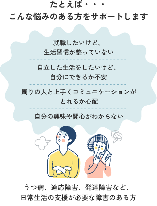 ※障害者手帳をお持ちでない方でも、医師の診断・定期的な通院(自立支援医療)などがあれば利用対象になりますので、まずはご相談ください。
