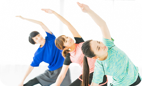 ヨガマットを敷き、インストラクター指導のもとストレッチ~筋力トレーニングまで幅広い運動をします。